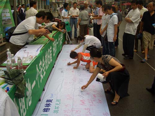通過宣傳,很多市民欣然簽名,表示要從我做起,把廢舊電池投入相應的回收箱。市委常委、宣傳部長劉天忠、本社社長吳道銀親臨現(xiàn)場,并紛紛簽名以作表率。最后,志愿者們對城區(qū)的格林美廢舊電池回收箱進行了全面清理。